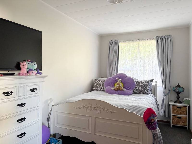 Inside, the sunny living area features large windows and a heat pump for year-round comfort. The kitchen is well-equipped and flows through to the dining area, making everyday living simple and practical.